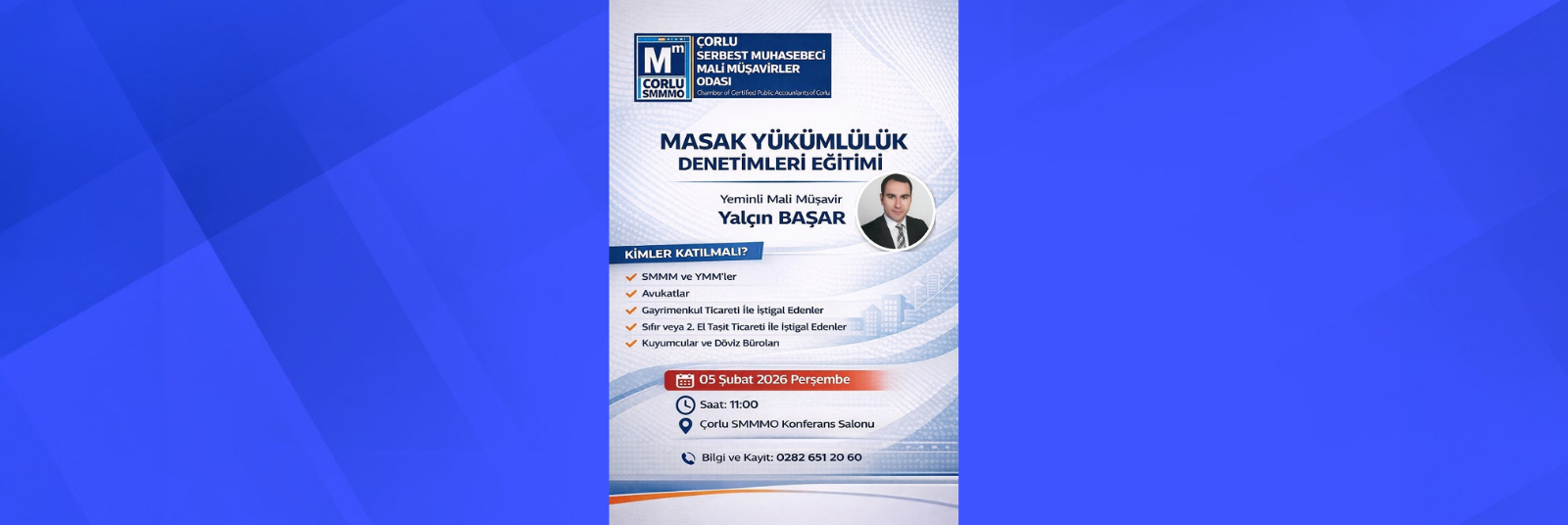 Çorlu Serbest Muhasebeci Mali Müşavirler (SMMM) Odasında düzenlenecek olan " Masak Yükümlülük Denetimleri " konulu seminer; 05 Şubat 2026 Perşembe Günü saat 11.00'da başlayacak ve Çorlu SMMM Odası Konferans Salonu'nda gerçekleştirilecek.