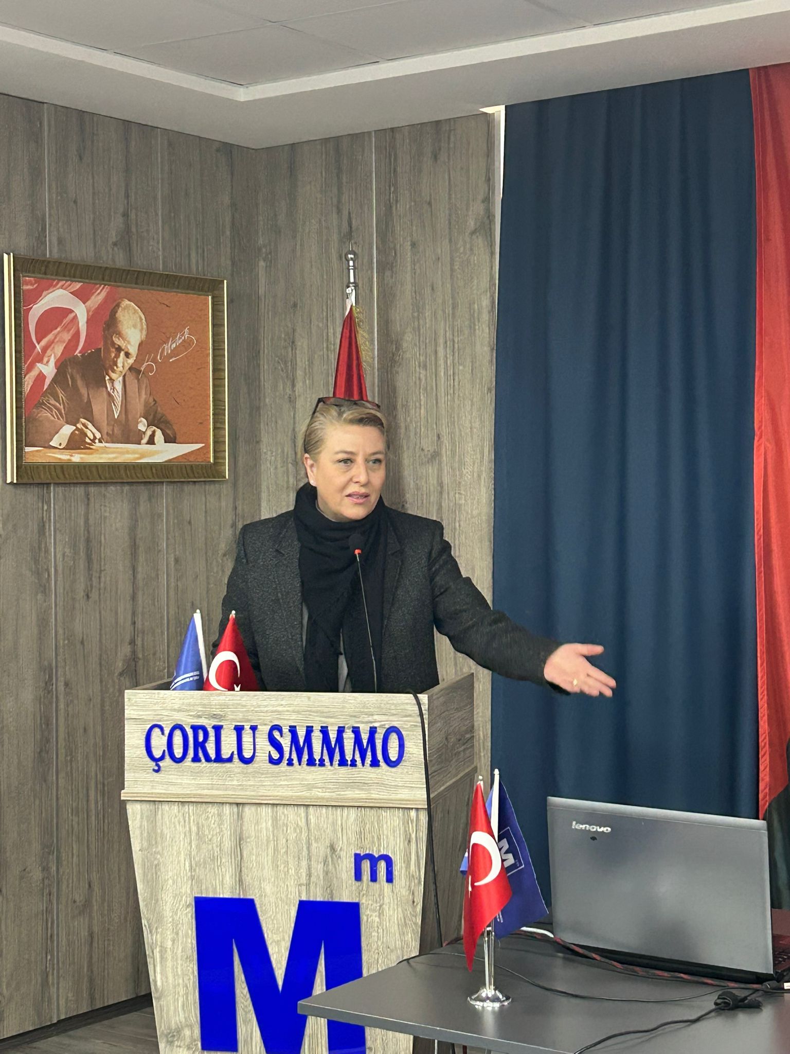 Eğitim seminerinin açılış konuşmasını, Odamız Yönetim Kurulu Başkanı Sayın Ayşe EROĞLU gerçekleştirdi.